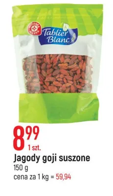 Cena produktu r贸偶ni si臋 w zale偶no艣ci od wybranego sklepu. Niestety nie posiadamy danych o aktualnych promocjach, jednak w艣r贸d archiwalnych ofert Jagody goji suszone Wiod膮ca marka tablier blanc kosztuje od 8,49 z艂.