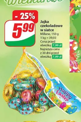 Cena produktu r贸偶ni si臋 w zale偶no艣ci od wybranego sklepu. Produkt Jajeczka czekoladowe nadziewane Milano zone mo偶esz kupi膰 w promocji ju偶 od 9,99 z艂 do 18,99 z艂. Najta艅sza oferta, jak膮 mamy w naszej bazie jest z sieci Lidl. Jajeczka czekoladowe nadziewane Milano zone kosztuje aktualnie 9,99 z艂. Zobacz ofert臋