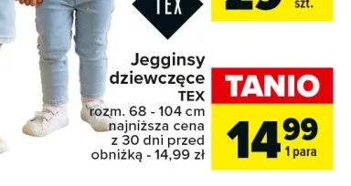 Cena produktu r贸偶ni si臋 w zale偶no艣ci od wybranego sklepu. Niestety nie posiadamy danych o aktualnych promocjach, jednak w艣r贸d archiwalnych ofert Jegginsy dziewcz臋ce 68-104 cm Tex kosztuje od 14,99 z艂.