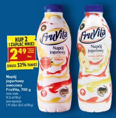 Cena produktu r贸偶ni si臋 w zale偶no艣ci od wybranego sklepu. Niestety nie posiadamy danych o aktualnych promocjach, jednak w艣r贸d archiwalnych ofert Jogurt pitny jab艂ko-gruszka Fruvita kosztuje od 2,49 z艂.