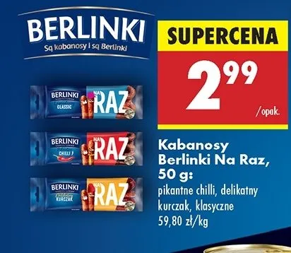 Cena produktu r贸偶ni si臋 w zale偶no艣ci od wybranego sklepu. Produkt Kabanosy delikatny kurczak Morliny berlinki na raz mo偶esz kupi膰 w promocji ju偶 od 4,89 z艂. Najta艅sza oferta, jak膮 mamy w naszej bazie jest z sieci Biedronka. Kabanosy delikatny kurczak Morliny berlinki na raz kosztuje aktualnie 4,89 z艂. Zobacz ofert臋