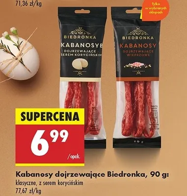 Cena produktu r贸偶ni si臋 w zale偶no艣ci od wybranego sklepu. Niestety nie posiadamy danych o aktualnych promocjach, jednak w艣r贸d archiwalnych ofert Kabanosy dojrzewaj膮ce klasyczne Biedronka kosztuje od 6,99 z艂.