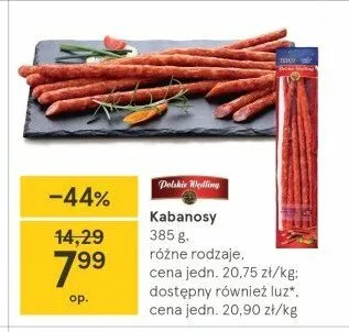 Cena produktu r贸偶ni si臋 w zale偶no艣ci od wybranego sklepu. Produkt Kabanosy pikantne Polskie w臋dliny mo偶esz kupi膰 w promocji ju偶 od 4,89 z艂. Najta艅sza oferta, jak膮 mamy w naszej bazie jest z sieci Carrefour. Kabanosy pikantne Polskie w臋dliny kosztuje aktualnie 4,89 z艂. Zobacz ofert臋