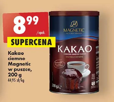 Cena produktu r贸偶ni si臋 w zale偶no艣ci od wybranego sklepu. Niestety nie posiadamy danych o aktualnych promocjach, jednak w艣r贸d archiwalnych ofert Kakao extra ciemne puszka Magnetic kosztuje od 8,99 z艂.