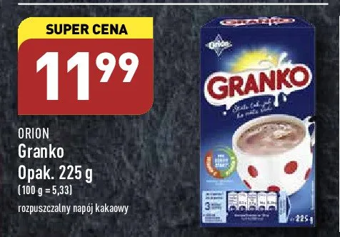 Cena produktu r贸偶ni si臋 w zale偶no艣ci od wybranego sklepu. Niestety nie posiadamy danych o aktualnych promocjach, jednak w艣r贸d archiwalnych ofert Kakao rozpuszczalne ORION GRANKO kosztuje od 11,99 z艂.