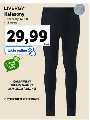 Cena produktu r贸偶ni si臋 w zale偶no艣ci od wybranego sklepu. Niestety nie posiadamy danych o aktualnych promocjach, jednak w艣r贸d archiwalnych ofert Kalesony m臋skie m-xxl Livergy kosztuje od 29,99 z艂.