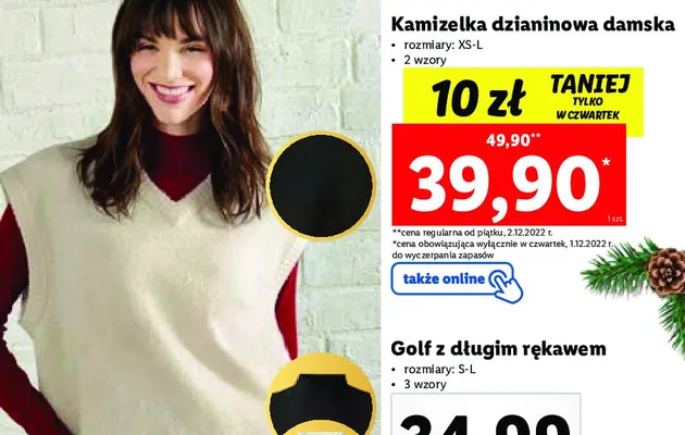 Cena produktu r贸偶ni si臋 w zale偶no艣ci od wybranego sklepu. Produkt Kamizelka damska dzianinowa mo偶esz kupi膰 w promocji ju偶 od 39,99 z艂. Najta艅sza oferta, jak膮 mamy w naszej bazie jest z sieci Lidl. Kamizelka damska dzianinowa kosztuje aktualnie 39,99 z艂. Zobacz ofert臋