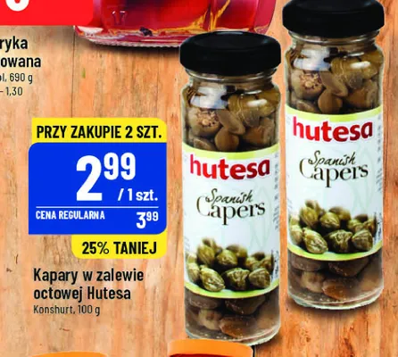 Cena produktu r贸偶ni si臋 w zale偶no艣ci od wybranego sklepu. Niestety nie posiadamy danych o aktualnych promocjach, jednak w艣r贸d archiwalnych ofert Kapary Hutesa kosztuje od 2,49 z艂 do 2,99 z艂.