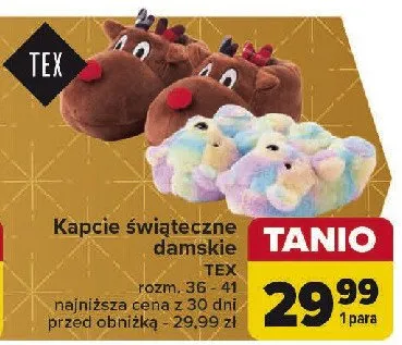 Cena produktu r贸偶ni si臋 w zale偶no艣ci od wybranego sklepu. Produkt Kapcie damskie 36-41 Tex mo偶esz kupi膰 w promocji ju偶 od 24,99 z艂. Najta艅sza oferta, jak膮 mamy w naszej bazie jest z sieci Biedronka. Kapcie damskie 36-41 Tex kosztuje aktualnie 24,99 z艂. Zobacz ofert臋