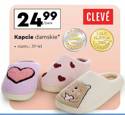 Cena produktu r贸偶ni si臋 w zale偶no艣ci od wybranego sklepu. Produkt Kapcie damskie 37-41 Cleve mo偶esz kupi膰 w promocji ju偶 od 24,99 z艂. Najta艅sza oferta, jak膮 mamy w naszej bazie jest z sieci Biedronka. Kapcie damskie 37-41 Cleve kosztuje aktualnie 24,99 z艂. Zobacz ofert臋