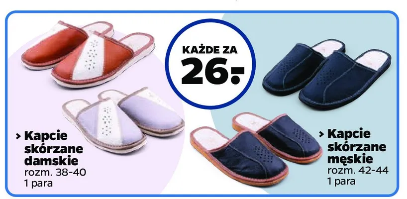 Zastanawiasz si臋, gdzie kupi膰 i ile kosztuje produkt Kapcie damskie sk贸rzane 38-40? Regularnie sprawdzamy, czy jest promocja na ten produkt w Biedronka, Lidl, Kaufland, Auchan, Netto, Makro i innych sklepach. Aktualnie nie posiadamy ofert promocyjnych na ten produkt.