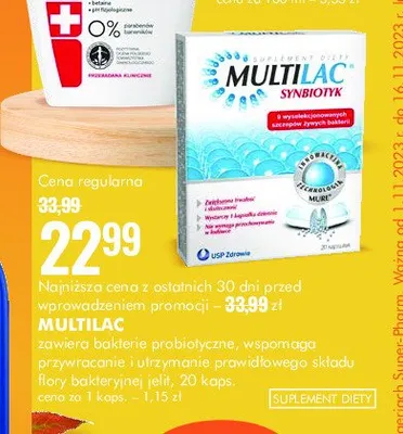 Cena produktu różni się w zależności od wybranego sklepu. Niestety nie posiadamy danych o aktualnych promocjach, jednak wśród archiwalnych ofert Kapsłuki uzupełniające florę bakteryjną 2-pack Multilac kosztuje od 19,99 zł do 26,99 zł.