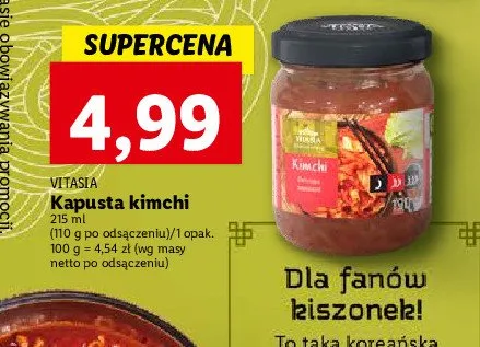 Szukam oryginalnego Korea艅skiego Kimchi producent Vitasia Korean Style. Do niedawna mo偶na by艂o kupi膰 w marketach Lidl, dzi艣 ju偶 tego kupi膰 nie mo偶na. Szkoda! To co jest teraz na polskim rynku pn KIMCHI, to idiotyczne podr贸bki.
