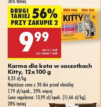 Cena produktu różni się w zależności od wybranego sklepu. Niestety nie posiadamy danych o aktualnych promocjach, jednak wśród archiwalnych ofert Karma dla kota 3 x kurczak + 3 x jagnięcina + 3 x wołowina + 3 x łosoś Kitty kosztuje od 9,99 zł do 11,99 zł.