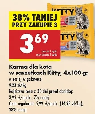 Cena produktu różni się w zależności od wybranego sklepu. Niestety nie posiadamy danych o aktualnych promocjach, jednak wśród archiwalnych ofert Karma dla kota łosoś/pstrąg + kurczak wątróbka w galarecie Kitty kosztuje od 3,69 zł do 4,39 zł.