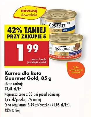 Cena produktu r贸偶ni si臋 w zale偶no艣ci od wybranego sklepu. Niestety nie posiadamy danych o aktualnych promocjach, jednak w艣r贸d archiwalnych ofert Karma dla kota mus z kurczaka Purina gourmet kosztuje od 1,79 z艂 do 1,99 z艂.