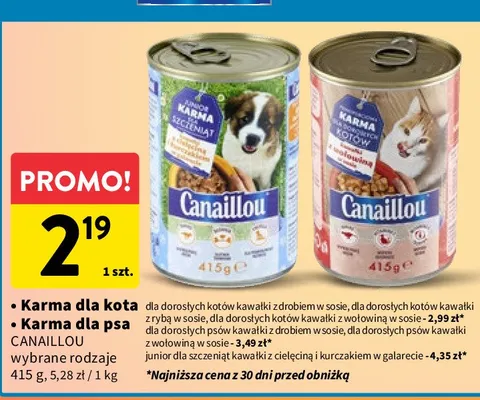 Cena produktu r贸偶ni si臋 w zale偶no艣ci od wybranego sklepu. Niestety nie posiadamy danych o aktualnych promocjach, jednak w艣r贸d archiwalnych ofert Karma dla kota ryba w sosie Canaillou kosztuje od 1,99 z艂 do 2,19 z艂.
