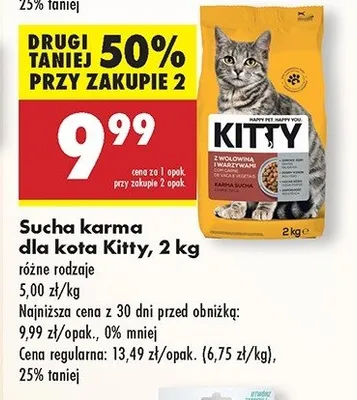 Cena produktu r贸偶ni si臋 w zale偶no艣ci od wybranego sklepu. Niestety nie posiadamy danych o aktualnych promocjach, jednak w艣r贸d archiwalnych ofert Karma dla kota z wo艂owin膮 i warzywami Kitty kosztuje od 9,99 z艂 do 11,99 z艂.