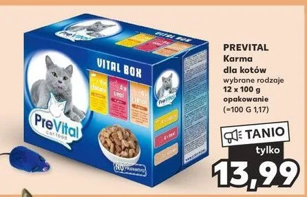 Cena produktu różni się w zależności od wybranego sklepu. Niestety nie posiadamy danych o aktualnych promocjach, jednak wśród archiwalnych ofert Karma dla kotów z kurczakiem wołowiną królikiem i indykiem Prevital kosztuje od 12,99 zł do 15 zł.