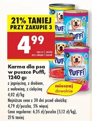 Cena produktu r贸偶ni si臋 w zale偶no艣ci od wybranego sklepu. Niestety nie posiadamy danych o aktualnych promocjach, jednak w艣r贸d archiwalnych ofert Karma dla psa z ciel臋cin膮 Puffi kosztuje od 4,79 z艂 do 4,99 z艂.