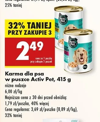 Cena produktu r贸偶ni si臋 w zale偶no艣ci od wybranego sklepu. Niestety nie posiadamy danych o aktualnych promocjach, jednak w艣r贸d archiwalnych ofert Karma dla psa z drobiem w sosie ACTIV PET LIGHT kosztuje od 2,49 z艂.