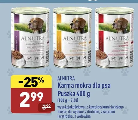 Cena produktu różni się w zależności od wybranego sklepu. Niestety nie posiadamy danych o aktualnych promocjach, jednak wśród archiwalnych ofert Karma dla psa z kawałeczkami świeżego mięsa drób Alnutra kosztuje od 2,9 zł do 3,19 zł.