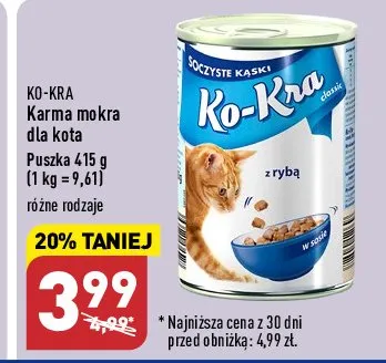 Cena produktu r贸偶ni si臋 w zale偶no艣ci od wybranego sklepu. Niestety nie posiadamy danych o aktualnych promocjach, jednak w艣r贸d archiwalnych ofert Karma soczyste k膮ski z ryb膮 Ko-kra kosztuje od 1,49 z艂 do 3,99 z艂.