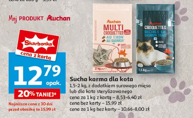 Cena produktu różni się w zależności od wybranego sklepu. Niestety nie posiadamy danych o aktualnych promocjach, jednak wśród archiwalnych ofert Karma wilgotna dla psa adult croquettes moelleuses z wołowiną Auchan różnorodne (logo czerwone) kosztuje od 12,79 zł do 16,99 zł.