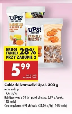 Cena produktu r贸偶ni si臋 w zale偶no艣ci od wybranego sklepu. Niestety nie posiadamy danych o aktualnych promocjach, jednak w艣r贸d archiwalnych ofert Karmelki mleczne Ups! kosztuje od 3,33 z艂 do 5,99 z艂.