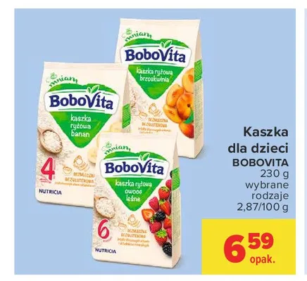 Cena produktu różni się w zależności od wybranego sklepu. Niestety nie posiadamy danych o aktualnych promocjach, jednak wśród archiwalnych ofert Kaszka ryżowa owoce leśne Bobovita kosztuje od 6,09 zł do 6,59 zł.