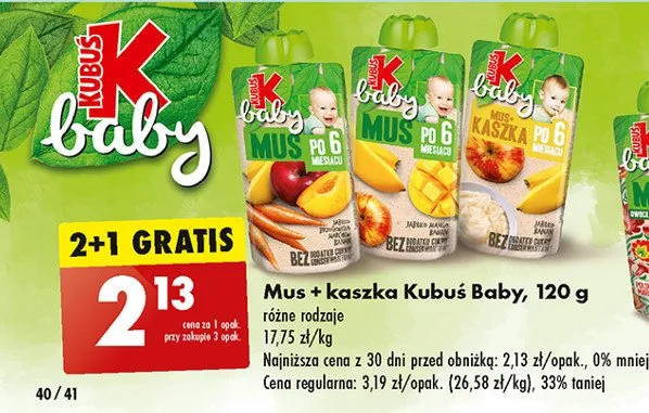 Cena produktu różni się w zależności od wybranego sklepu. Niestety nie posiadamy danych o aktualnych promocjach, jednak wśród archiwalnych ofert Kaszka ryżowa z jabłkiem i bananem Kubuś baby kosztuje od 1,69 zł do 2,13 zł.