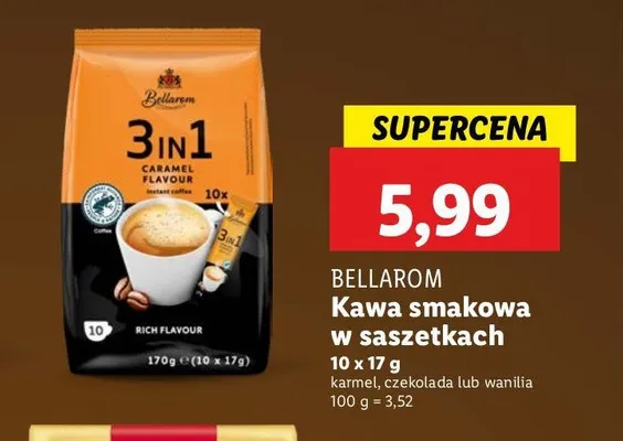 Cena produktu r贸偶ni si臋 w zale偶no艣ci od wybranego sklepu. Niestety nie posiadamy danych o aktualnych promocjach, jednak w艣r贸d archiwalnych ofert Kawa 3in1 waniliowa Bellarom kosztuje od 5,99 z艂.