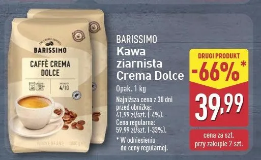 Cena produktu r贸偶ni si臋 w zale偶no艣ci od wybranego sklepu. Niestety nie posiadamy danych o aktualnych promocjach, jednak w艣r贸d archiwalnych ofert Kawa Barissimo caffe crema dolce kosztuje od 39,99 z艂 do 52,99 z艂.