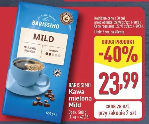 Cena produktu r贸偶ni si臋 w zale偶no艣ci od wybranego sklepu. Niestety nie posiadamy danych o aktualnych promocjach, jednak w艣r贸d archiwalnych ofert Kawa Barissimo mild kosztuje od 18,89 z艂 do 23,99 z艂.
