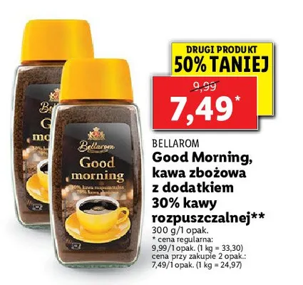 Zastanawiasz si臋, gdzie kupi膰 i ile kosztuje produkt Kawa Bellarom good morning? Regularnie sprawdzamy, czy jest promocja na ten produkt w Biedronka, Lidl, Kaufland, Auchan, Netto, Makro i innych sklepach. Aktualnie posiadamy 1 ofert臋 promocyjn膮 na ten produkt. Ceny zaczynaj膮 si臋 od z艂!