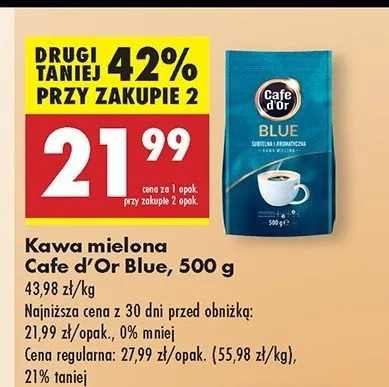 Cena produktu r贸偶ni si臋 w zale偶no艣ci od wybranego sklepu. Niestety nie posiadamy danych o aktualnych promocjach, jednak w艣r贸d archiwalnych ofert Kawa Cafe d'or blue kosztuje od 12,79 z艂 do 21,99 z艂.