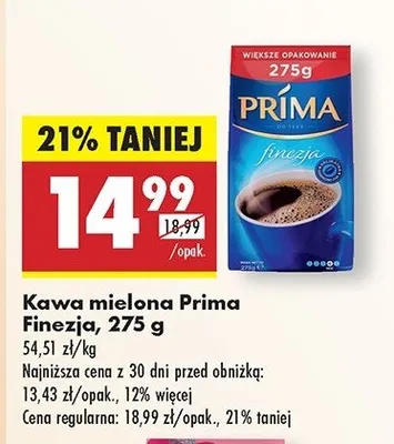 Zastanawiasz si臋, gdzie kupi膰 i ile kosztuje produkt Kawa Prima Finezja? Regularnie sprawdzamy, czy jest promocja na ten produkt w Biedronka, Lidl, Kaufland, Auchan, Netto, Makro i innych sklepach. Aktualnie posiadamy 1 ofert臋 promocyjn膮 na ten produkt. Ceny zaczynaj膮 si臋 od 24,99z艂!