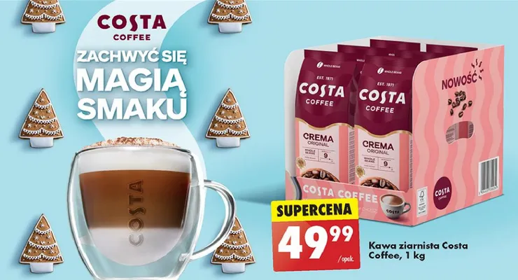 Cena produktu r贸偶ni si臋 w zale偶no艣ci od wybranego sklepu. Niestety nie posiadamy danych o aktualnych promocjach, jednak w艣r贸d archiwalnych ofert Kawa Costa coffee crema original kosztuje od 49,99 z艂.