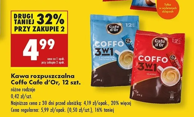 Zastanawiasz si臋, gdzie kupi膰 i ile kosztuje produkt Kawa rozpuszczalna 3 w 1 z magnezem Cafe d'or coffo? Regularnie sprawdzamy, czy jest promocja na ten produkt w Biedronka, Lidl, Kaufland, Auchan, Netto, Makro i innych sklepach. Aktualnie nie posiadamy ofert promocyjnych na ten produkt.