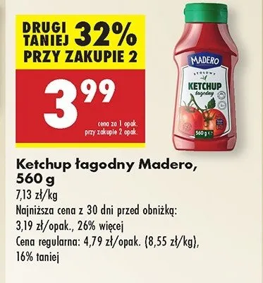 Cena produktu r贸偶ni si臋 w zale偶no艣ci od wybranego sklepu. Niestety nie posiadamy danych o aktualnych promocjach, jednak w艣r贸d archiwalnych ofert Ketchup 艂agodny Madero kosztuje od 3 z艂 do 3,99 z艂.