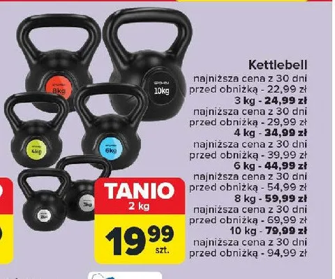 Cena produktu r贸偶ni si臋 w zale偶no艣ci od wybranego sklepu. Produkt Kettlebell 10 kg mo偶esz kupi膰 w promocji ju偶 od 49,99 z艂. Najta艅sza oferta, jak膮 mamy w naszej bazie jest z sieci Kaufland. Kettlebell 10 kg kosztuje aktualnie 49,99 z艂. Zobacz ofert臋