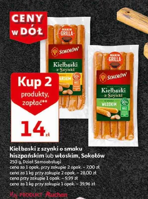 Cena produktu różni się w zależności od wybranego sklepu. Niestety nie posiadamy danych o aktualnych promocjach, jednak wśród archiwalnych ofert Kiełbaski z szynki w stylu hiszpańskim Sokołów kosztuje od 6,99 zł do 8,99 zł.