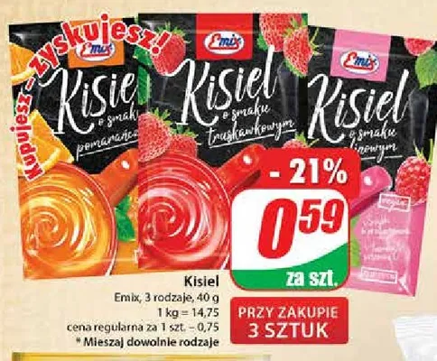 Cena produktu r贸偶ni si臋 w zale偶no艣ci od wybranego sklepu. Niestety nie posiadamy danych o aktualnych promocjach, jednak w艣r贸d archiwalnych ofert Kisiel bez cukru pomara艅czowy Emix kosztuje od 0,59 z艂.