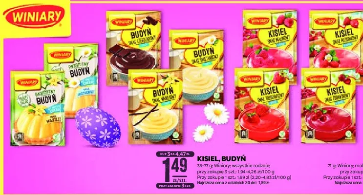 Cena produktu r贸偶ni si臋 w zale偶no艣ci od wybranego sklepu. Niestety nie posiadamy danych o aktualnych promocjach, jednak w艣r贸d archiwalnych ofert Kisiel malinowy Winiary kisiel kosztuje od 1,19 z艂 do 1,49 z艂.