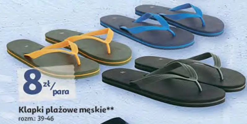 Cena produktu różni się w zależności od wybranego sklepu. Niestety nie posiadamy danych o aktualnych promocjach, jednak wśród archiwalnych ofert Klapki plażowe męskie rozm. 39-46 kosztuje od 8 zł.