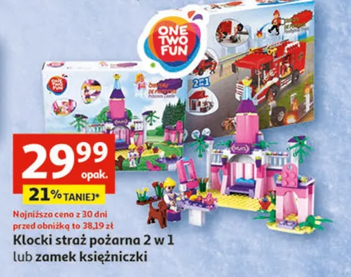 Cena produktu różni się w zależności od wybranego sklepu. Niestety nie posiadamy danych o aktualnych promocjach, jednak wśród archiwalnych ofert Klocki 2 w 1 zamek księżniczki One two fun kosztuje od 29,99 zł.