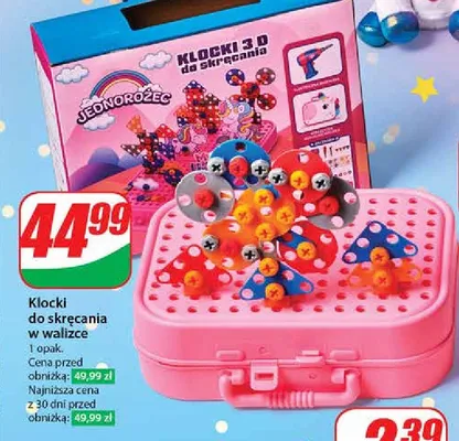 Cena produktu r贸偶ni si臋 w zale偶no艣ci od wybranego sklepu. Niestety nie posiadamy danych o aktualnych promocjach, jednak w艣r贸d archiwalnych ofert Klocki do skr臋cania w walizce kosztuje od 44,99 z艂.