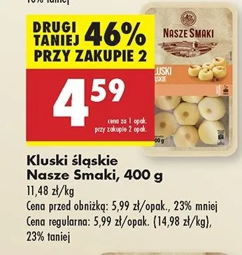 Cena produktu r贸偶ni si臋 w zale偶no艣ci od wybranego sklepu. Niestety nie posiadamy danych o aktualnych promocjach, jednak w艣r贸d archiwalnych ofert Kluski 艣laskie Nasze smaki kosztuje od 4,49 z艂 do 4,99 z艂.