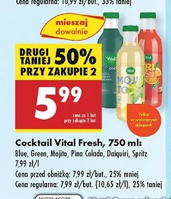 Cena produktu r贸偶ni si臋 w zale偶no艣ci od wybranego sklepu. Niestety nie posiadamy danych o aktualnych promocjach, jednak w艣r贸d archiwalnych ofert Koktail mojito Vital fresh kosztuje od 5,99 z艂 do 6,49 z艂.