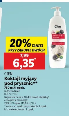 Cena produktu różni się w zależności od wybranego sklepu. Niestety nie posiadamy danych o aktualnych promocjach, jednak wśród archiwalnych ofert Koktajl myjący pod prysznic jeżyna ze śmietanką Cien kosztuje od 6,35 zł do 7,99 zł.